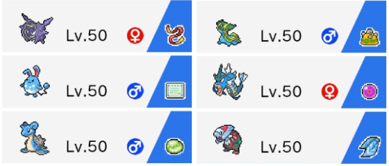 元々は見た目を一切気にしないでバトルで勝つことだけ考えて作ったタイプ統一パです。でもやっぱり好きなパーティで戦った方が楽しいです。青色ポケモン達がズラッと並んだこの感じはとてもお気に入りだったりします。