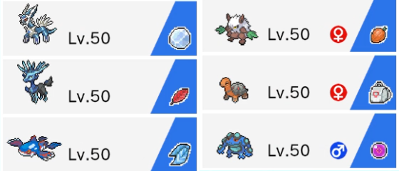 カイオーガの特性「あめふらし」を活かすために特性が「すいすい」(雨の時に素早さ2倍)のガマゲロゲを入れ、「ステルスロック」ができるコータスを入れたらこんなパーティになっていました。