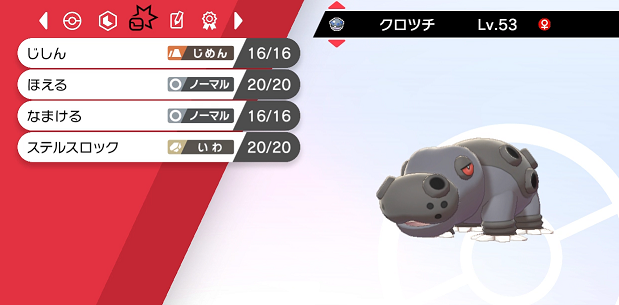 岩タイプの攻撃技が欲しい場面が多かったですが、4つの技はどれも捨てたくありません!「こおりのキバ」も覚えさせたいですし、技スペースの足りない、悩ましいポケモンです。