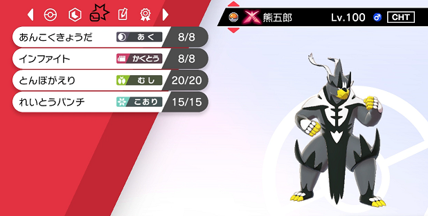 悪タイプの「じごくづき」を覚えていて、黒馬バドレックスや月食ネクロズマにめっぽう強いです!(どっちも悪やゴーストが4倍弱点)