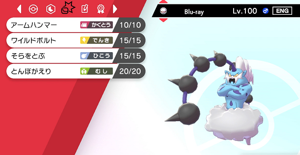 素早さを上げるため、性格は「おくびょう」で攻撃力に下降補正が掛かっていますが、物理攻撃の「ダブルウイング」を覚えています。