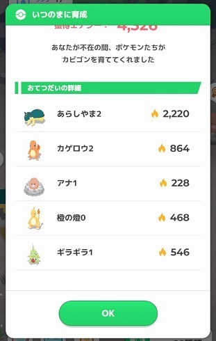 ↑こうして『いつのまに育成』を見ると、マグマラシだけ集めたエナジーが全然違います!カビゴンの好物きのみを3つずつ集めて来るのって強い……!