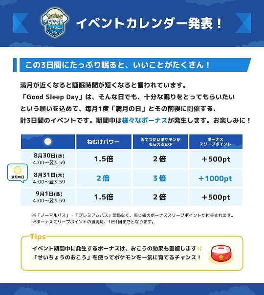 「ねむけパワー」2倍、経験値3倍、スリープポイント1000ptプレゼントなどの効果があります。