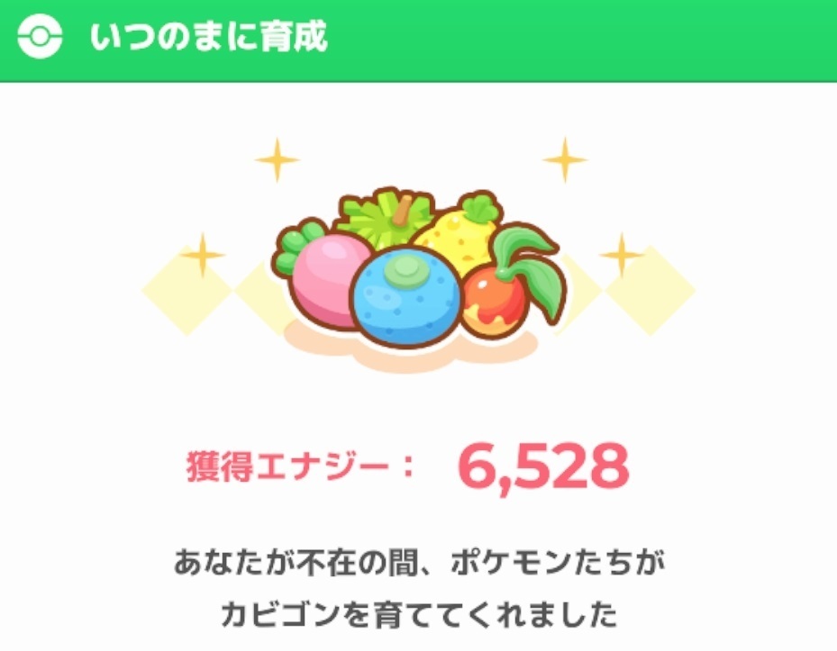 この状態で放置していると、きのみと食材を集めなくなる代わりに、拾って来るきのみ分のエナジーが『いつのまに育成』という形で、カビゴンに直接供給されるようになります。