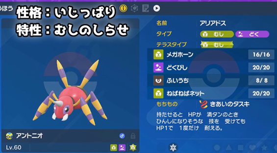 あまり素早くはありませんが、アリアドスの「ねばねばネット」でサポートしてもらえば先手を取りやすいです。