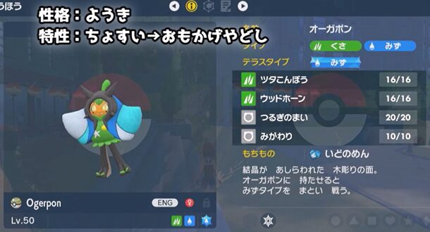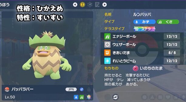オーガポンとタイプは被ってしまいますが、「すいすい」枠はルンパッパで頑張ってみました。