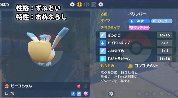 「すいすい」の発動で素早さが2倍、1.5倍になる水技、必中「ぼうふう」など。狙いがハッキリしてるので戦いやすかったです。